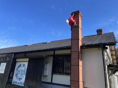 「有田×サンタプロジェクト 2024」窯元の煙突にサンタがよじ登っています!