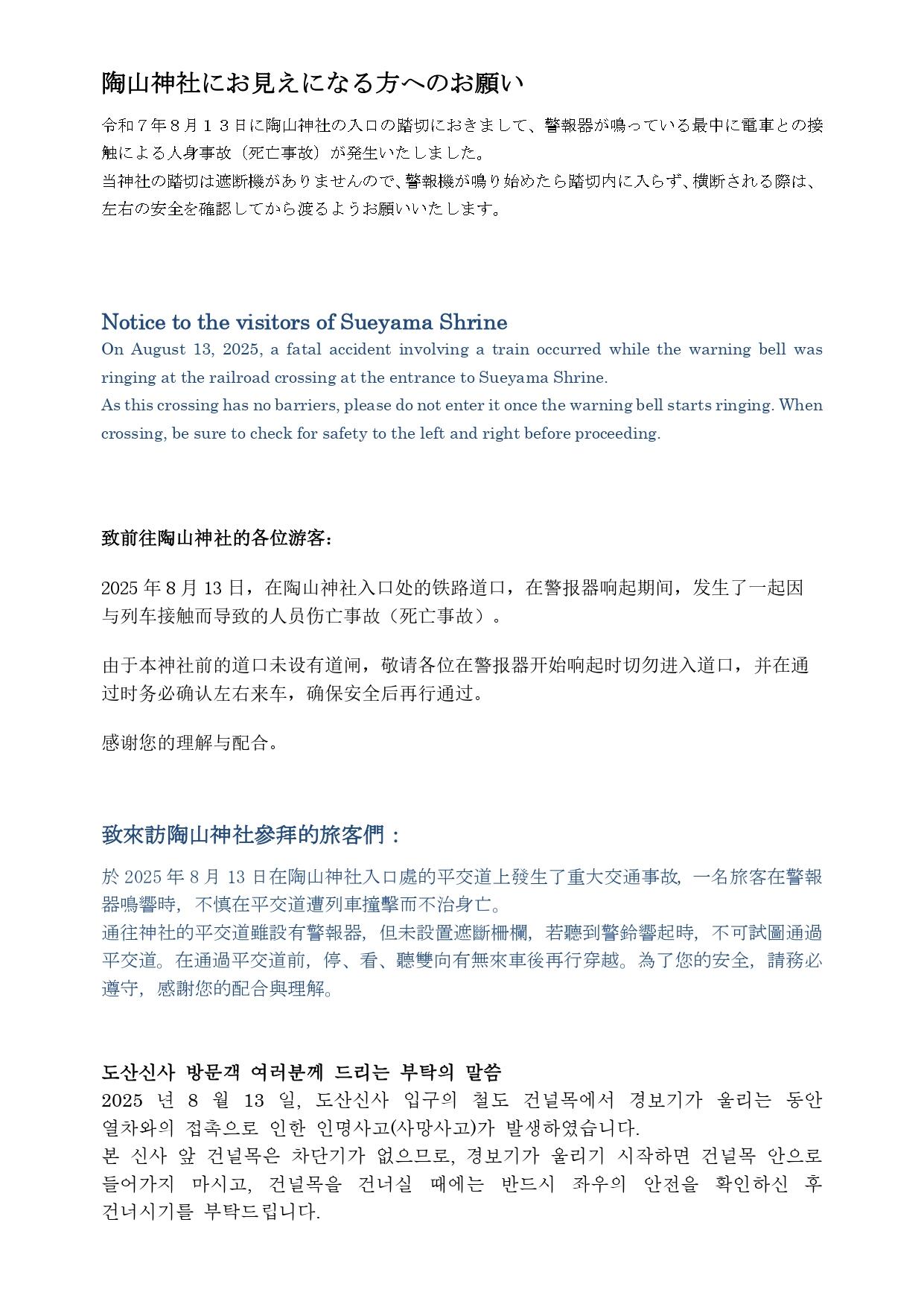 본 신사 앞 건널목은 차단기가 없으므로, 경보기가 울리기 시작하면 건널목 안으로 들어가지 마시고, 건널목을 건너실 때에는 반드시 좌우의 안전을 확인하신 후 건너시기를 부탁드립니다.