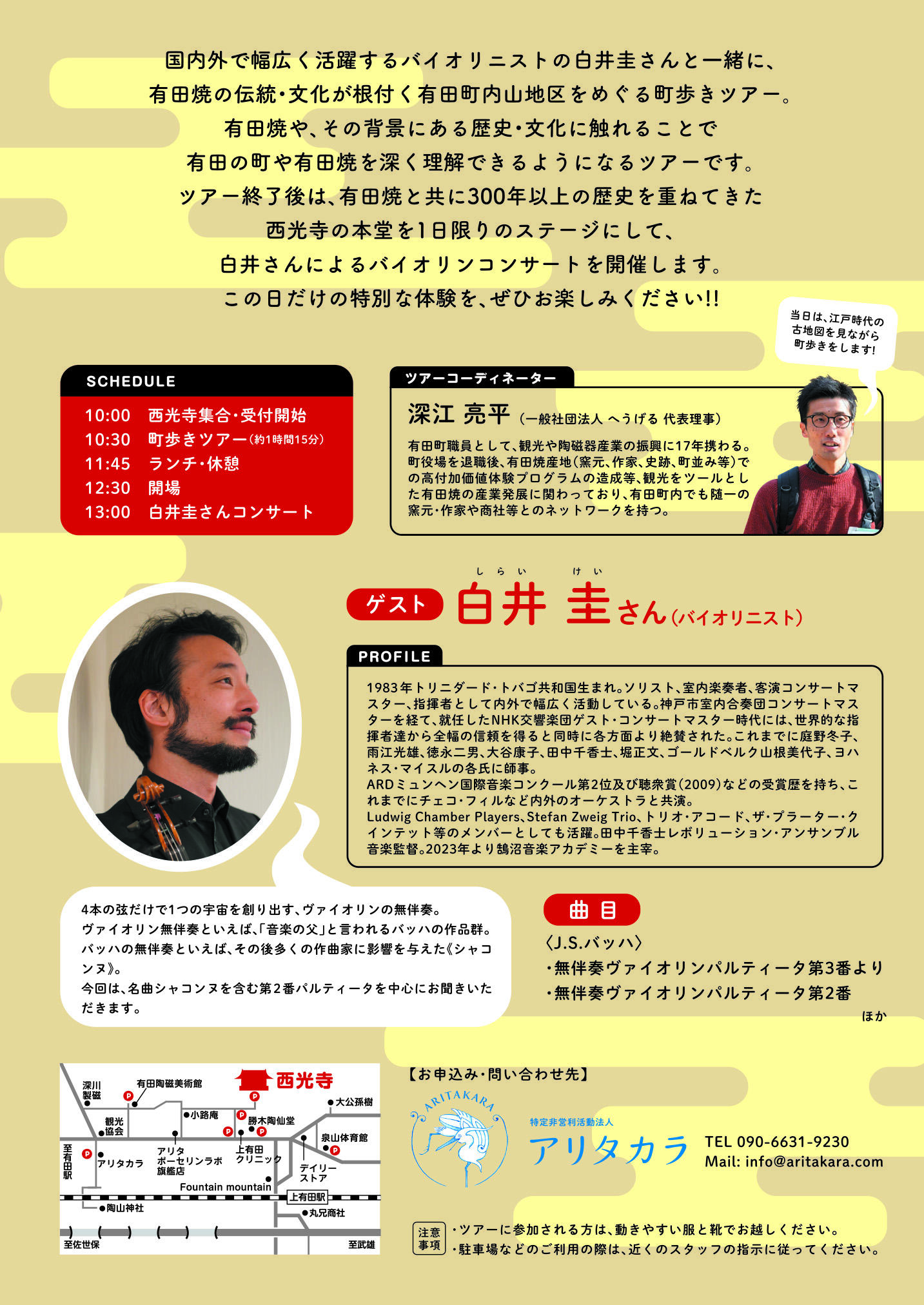 バイオリニスト白井圭さんとめぐる有田内山ツアー&お寺でコンサート