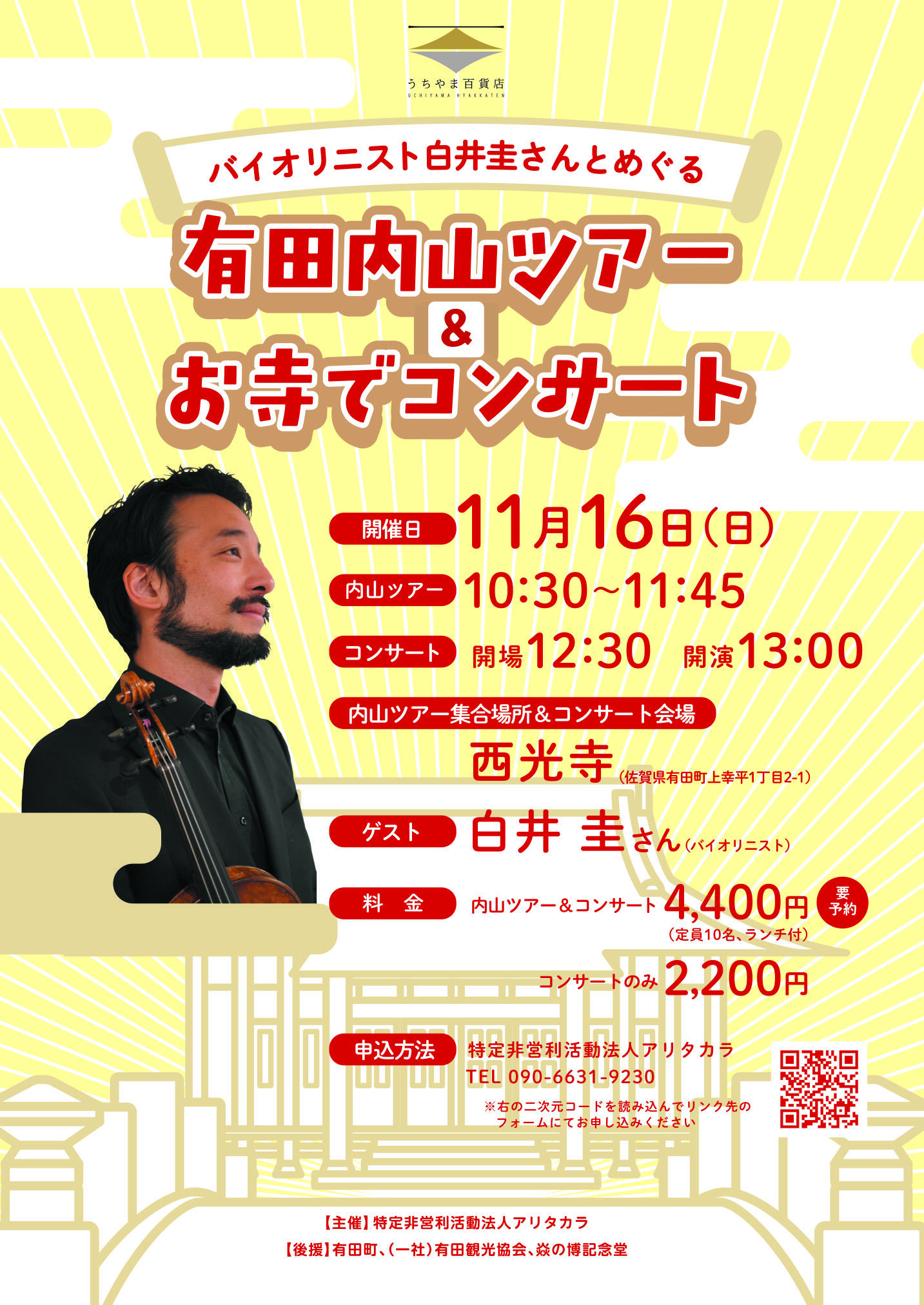 「バイオリニスト白井圭さんとめぐる有田内山ツアー&お寺でコンサート」が11月16日(日)に開催されます。