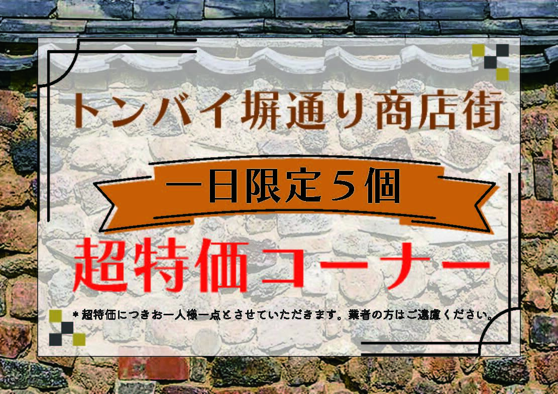 トンバイ塀通り商店会会員の店で、各店、1日5個5日間先着順に、お値打ち品が特別価格で販売されます。