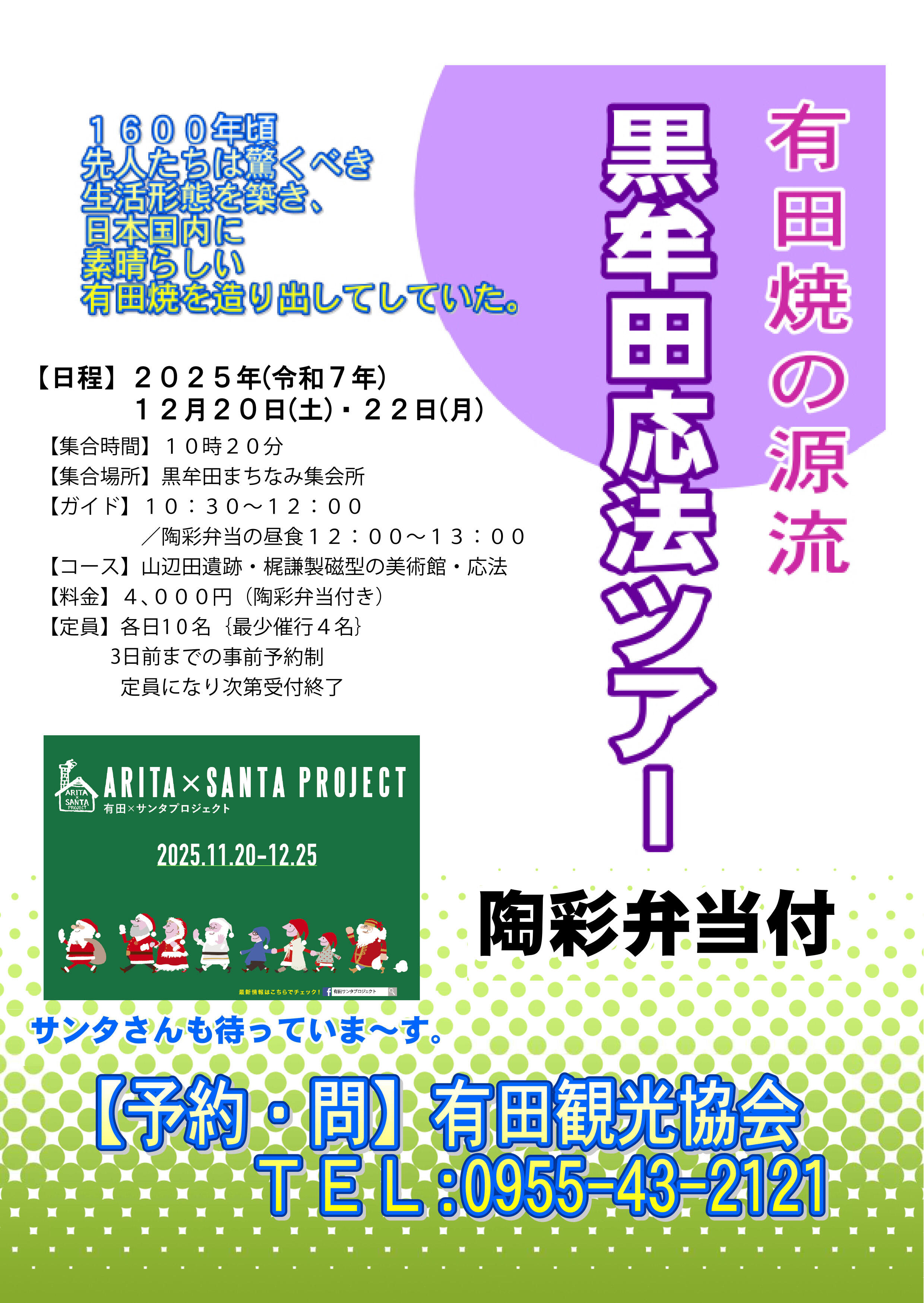 また、黒牟田・応法地区では有田の冬の風物詩「有田×サンタプロジェクト」の窯元の煙突を登るサンタさんもご覧いただけます!是非探してみてください。