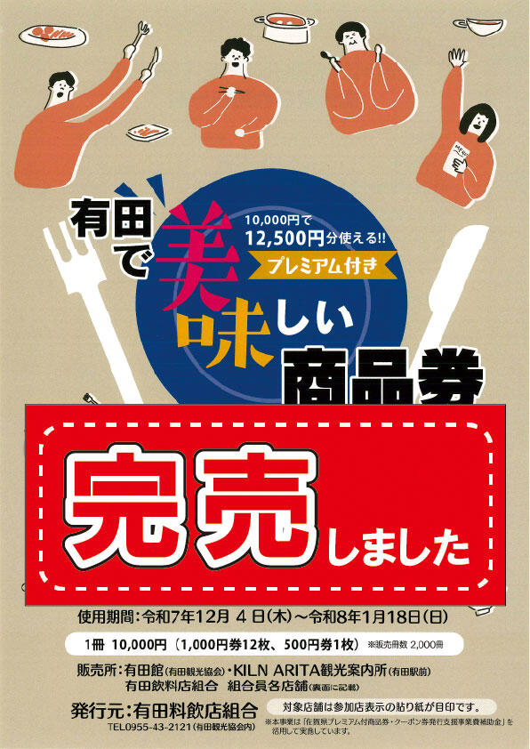 「有田で美味しい商品券」はキルンアリタ観光案内所と有田館(有田観光協会)の販売分は完売いたしました。