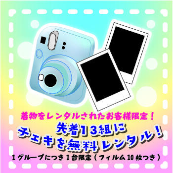 また、着物をレンタルされた先着13組様にチェキを無料貸し出しいたします! (フィルム10枚付き)