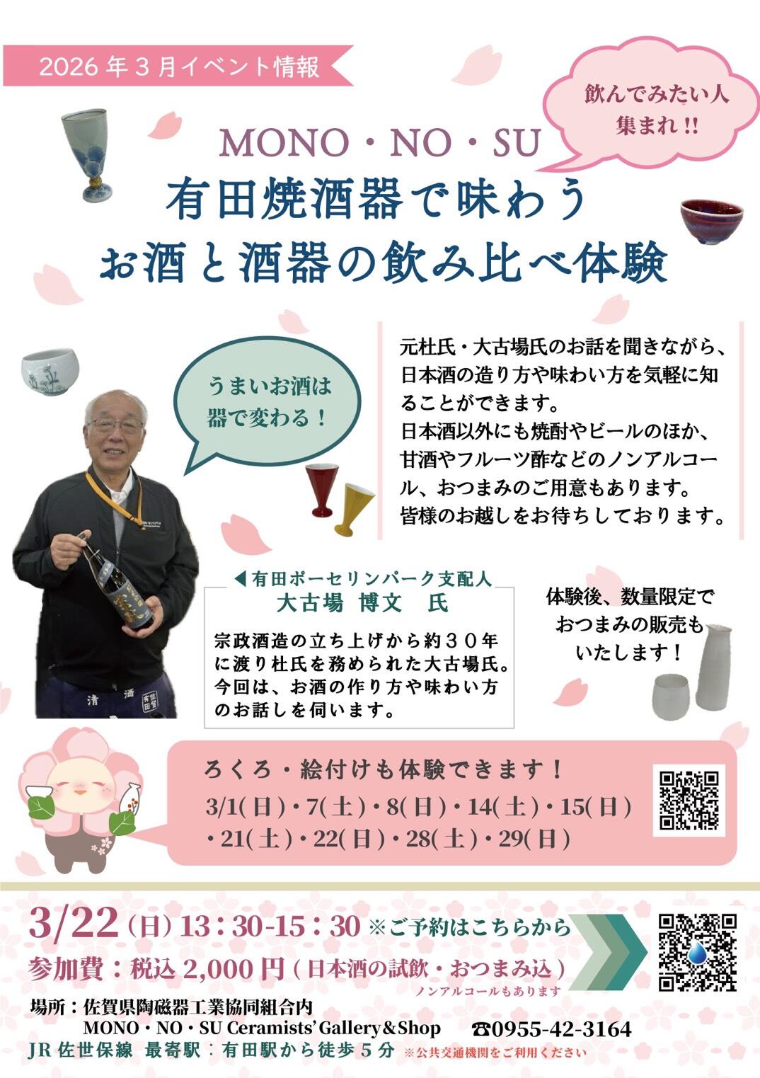 「MONO・NO・SU 有田焼酒器で味わうお酒と酒器の飲み比べ体験」を3月22日(日)に開催!